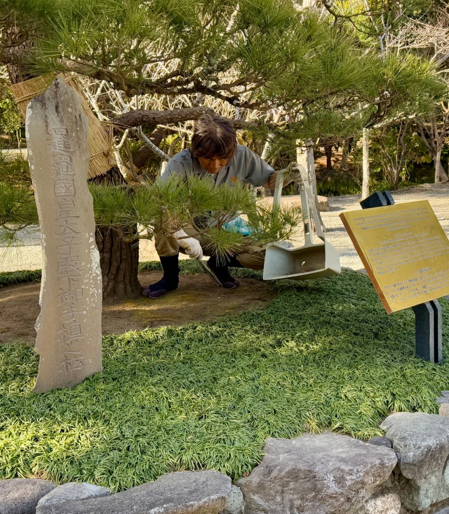 This gardener is picking up the pine needles with tweezers. Komachi Dori