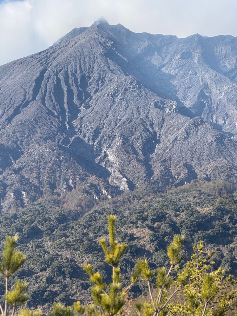Sakurajima Mountain is comprised of two peaks One is 1117 metres high, the other 1040 metres. It has erupted already 50 times so far this year. There are 300 ash collecting stations on the mountain. One side has deeper gulleys because the two mountains are of a different age… the newer has the deeper gullies.