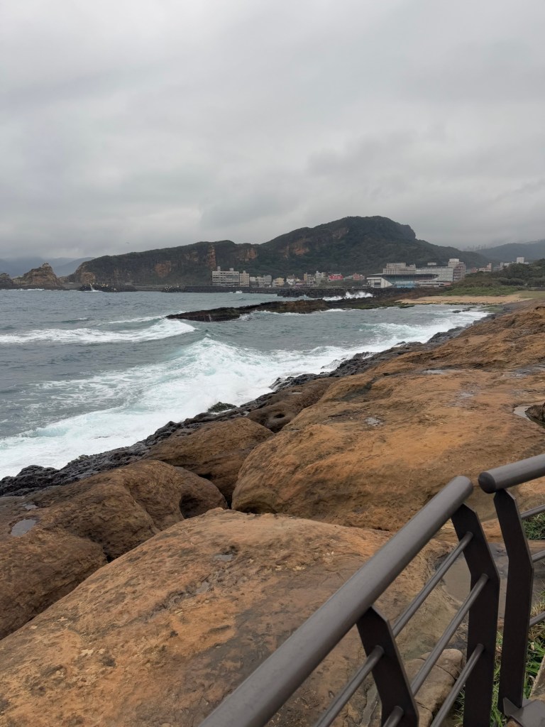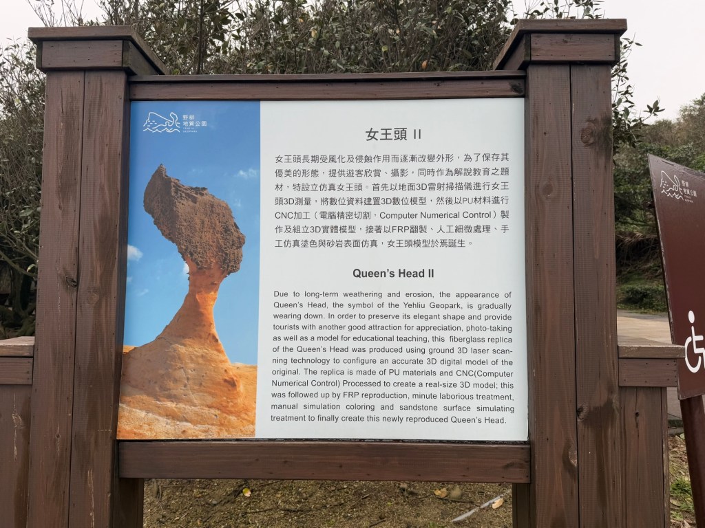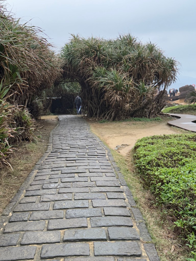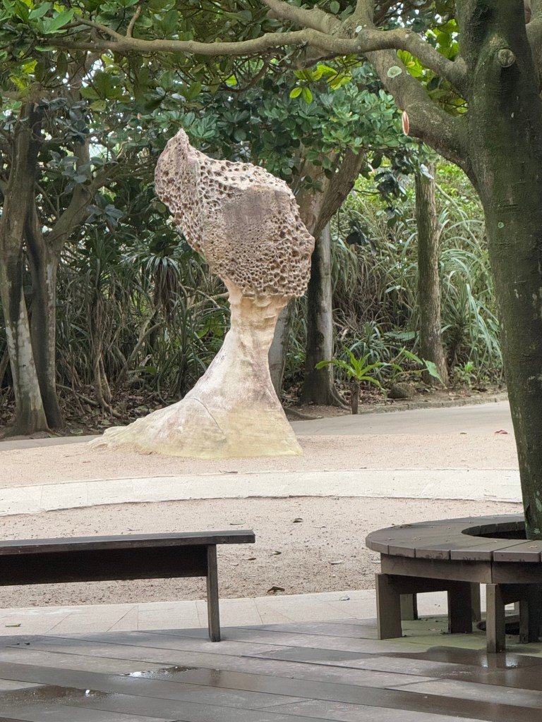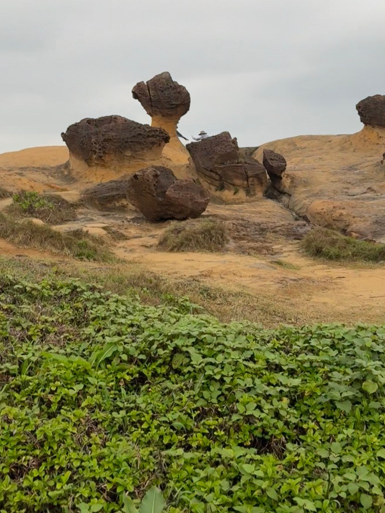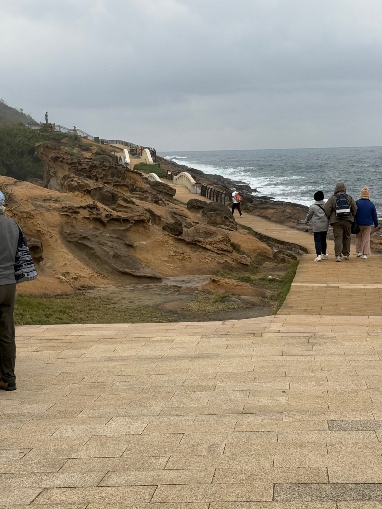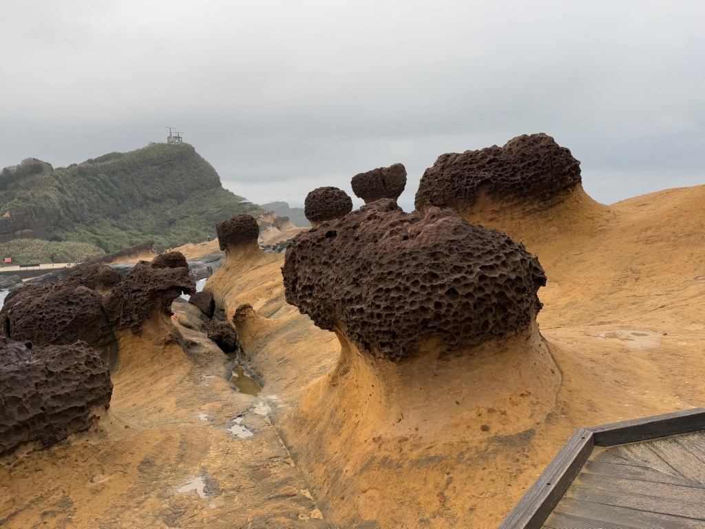 First stop is Yehliu Geo Park. The park is a peninsula that juts out into the sea for about a mile. There is lots of walking and steps to climb. The figures all have a hard top….. (looks like lava) with sandstone below. As a result of the wind, rain and ocean waves, etc., the figures have been carved into some very cool shapes…. The most significant is of “the queen” and the “fairy slipper”.