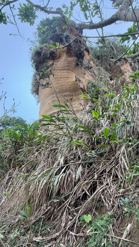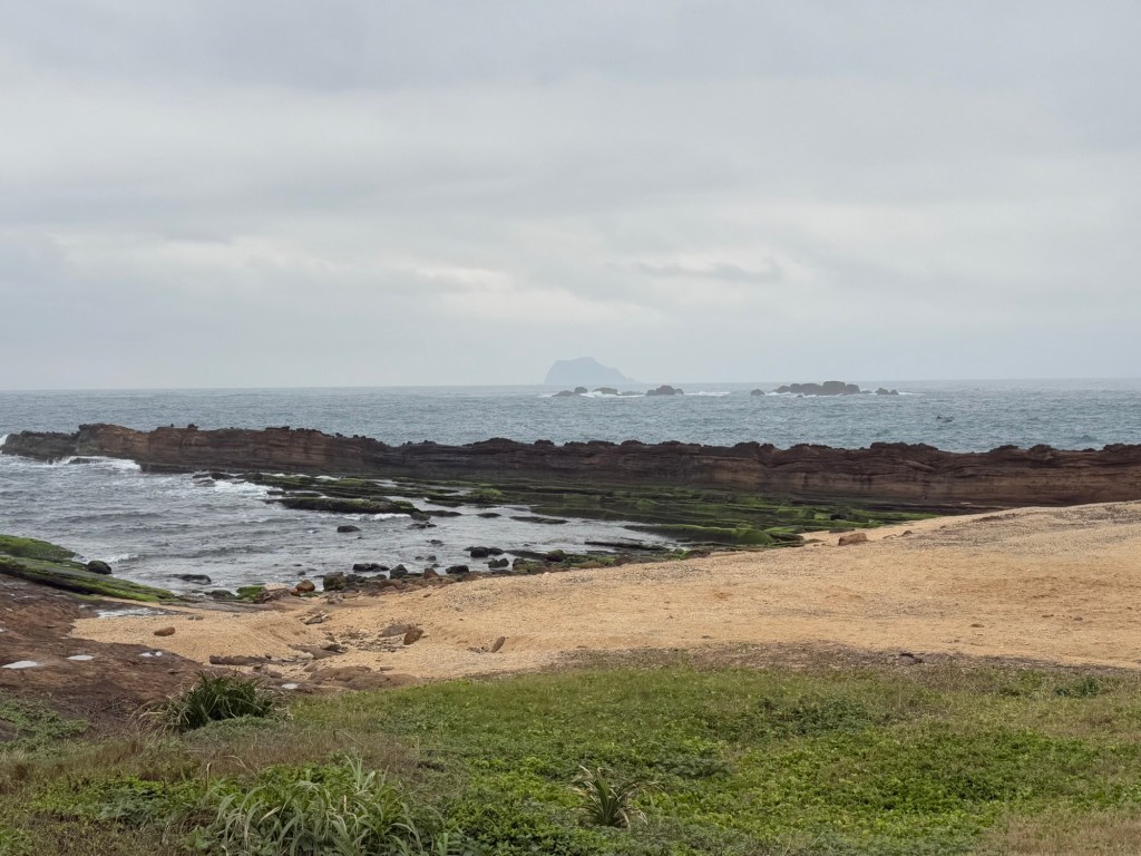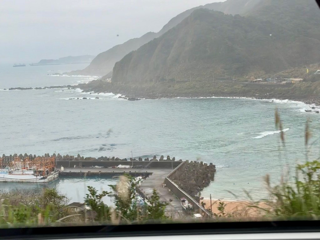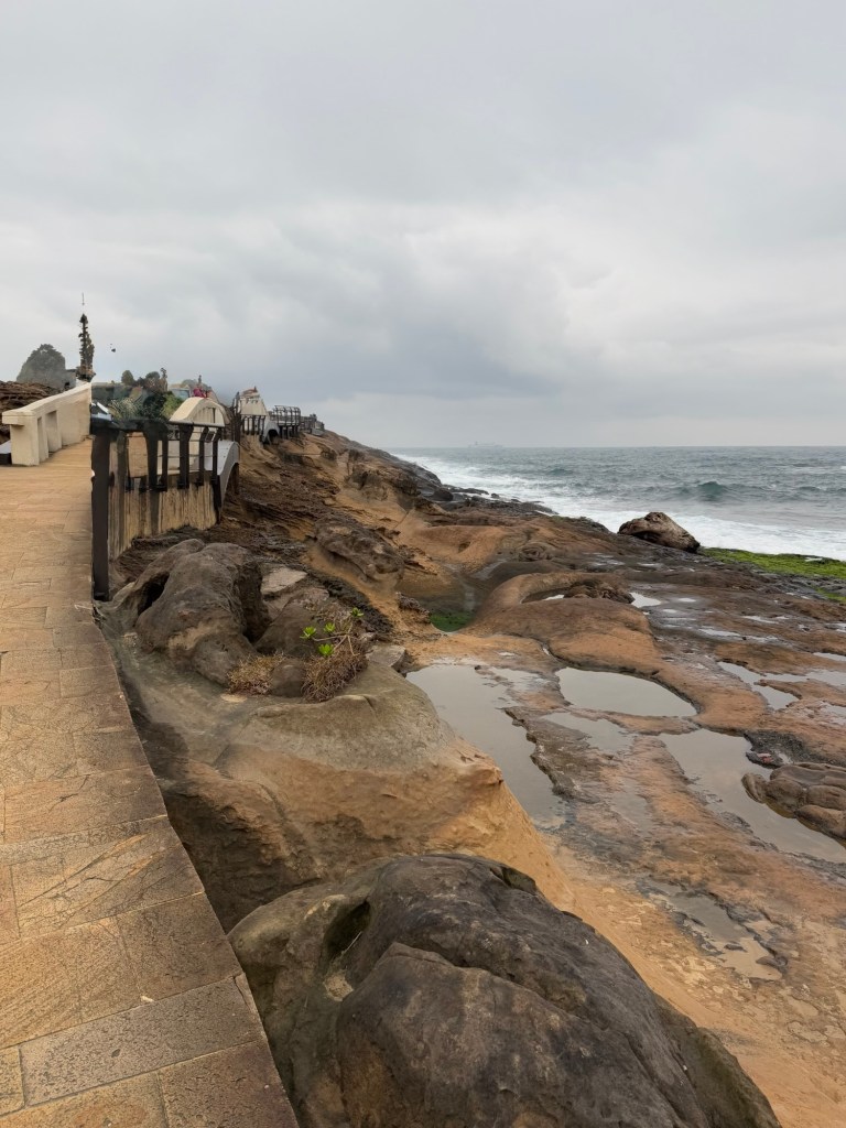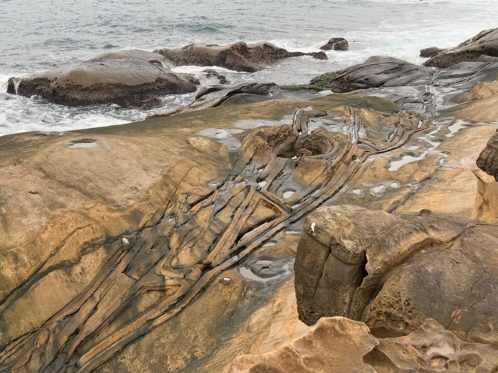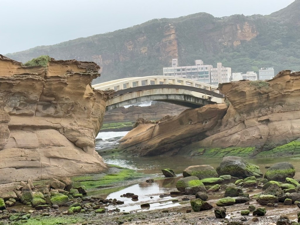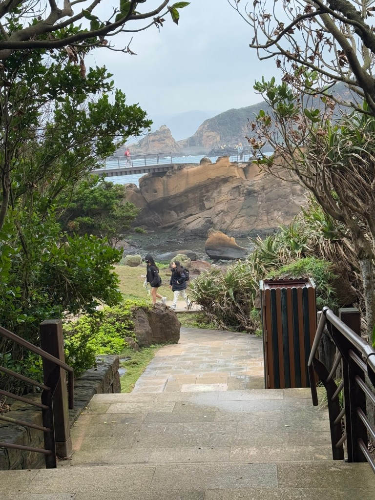 First stop is Yehliu Geo Park. The park is a peninsula that juts out into the sea for about a mile. There is lots of walking and steps to climb. The figures all have a hard top….. (looks like lava) with sandstone below. As a result of the wind, rain and ocean waves, etc., the figures have been carved into some very cool shapes…. The most significant is of “the queen” and the “fairy slipper”.